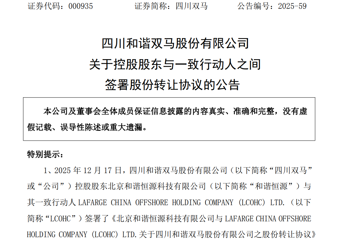 12月17日,四川和谐双马股份有限公司(证券简称“四川双马” )公告称配资公司最靠谱三个平台,公司控股股东北京和谐恒源科技有限公司(以下简称“和谐恒源”)与其一致行动人LAFARGE CHINA OFFSHORE HOLDING COMPANY (LCOHC) LTD.(以下简称“LCOHC”)签署了股份转让协议,LCOHC拟以协议转让的方式向和谐恒源转让其持有的公司4878.69万股股份,占公司总股本的6.39%,股份转让价格为22.32元/股,转让款总计10.89亿元。和谐恒源以自有及自筹资金支付转让款。