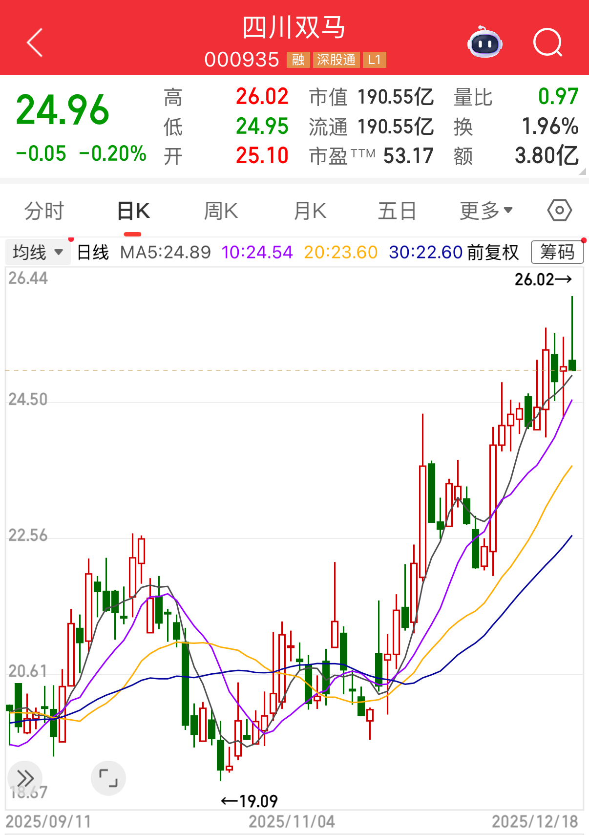 二级市场方面,截至18日收盘,四川双马报24.96元/股,总市值190.55亿元。