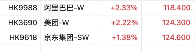 消息公布后,美团、阿里巴巴盘中拉升,一度大涨超3%,截至发稿,美团涨幅回落至2.22%,阿里巴巴涨2.33%,京东集团涨1.38%。